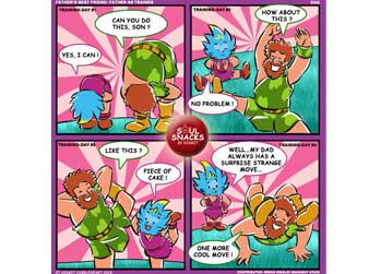 The 27th interactive comic strip for my Soul Snacks by Didgit have been uploaded to my Facebook and Twitter/ Twitpics accounts on Wednesday, July 3, 2013. The idea from this interactive comic strip again comes from Uncle Irwan Rinaldy and Aunty Yully Purwanti of Sahabat Ayah (Fathers Best Friend), a non-profit organization aiming to support Indonesian fathers to be more actively involved in their children upbringing. Just a few weeks ago, my father, Piko, showed you how wonderful it will be to have a father who can be our teacher as well. As you know, my father is the smartest and richest man in our village, Cragtop Caves. He knows a lot of things, including how to nurture our earth well in order to benefit from it. Uncle Boldo always has tons of fun with his son, Fuzzy! They have different kind of activities than my father and I, but equally fun and interesting! Uncle Boldo wants Fuzzy to train with him regularly so that he can share his coolest moves and skills to him. Uncle Boldo wants Fuzzy to be the worlds best circus performer! Looking on how the two train together, I am pretty sure Fuzzy will be the greatest in the future! He has a loving, caring and fun father who will be guiding and training him every step of the way. Now thats a great recipe for champion! And, if you like to tell your father and son or father and daughters cool story and have your own Soul Snacks by Didgit comic strip like this one, just write to me on my Facebooks account (Go to my web: www.didgitcobbleheart.com and click the Facebooks icon on the lower right hand side) or my Twitter/ Twitpics account @cobbleheart. Soul Snacks by Didgit is a weekly interactive comic strip that will be available on my Facebook and Twitter/ Twitpics accounts every Wednesday! Stay tune for the next edition, or better, send me your ideas so you can show your friends your own comic strip! Truly Yours, Didgit |