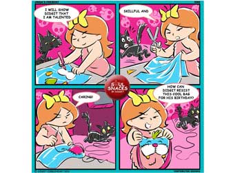 The 28th interactive comic strip for my Soul Snacks by Didgit have been uploaded to my Facebook and Twitter/ Twitpics accounts on Wednesday, July 10, 2013. The idea from this interactive comic strip again comes from my cute friend, Radinka. Did you remember that Radinka requested a story about me, skating? It was my third interactive comic, and it was way back in January! Since then, Radinka and her cool little brother, Rayendra, have been my dear friends, who often request cute and cool interactive comic stories! I love them both! This time, Radinka suggested that I made a story about Jinga, wanting to give me an art and craft present in the form of flannel bag! She is very detail oriented, can you tell? Ha.. ha.. ha... This idea is very interesting since as you all know, Jinga is not the kind of girl or friend who likes to share and care. So, I will make this idea in two parts! Lets see how Jinga shares next time! And, if you like to tell cool story and have your own Soul Snacks by Didgit comic strip like this one, just write to me on my Facebooks account (Go to my web: www.didgitcobbleheart.com and click the Facebooks icon on the lower right hand side) or my Twitter/ Twitpics account @cobbleheart. Soul Snacks by Didgit is a weekly interactive comic strip that will be available on my Facebook and Twitter/ Twitpics accounts every Wednesday! Stay tune for the next edition, or better, send me your ideas so you can show your friends your own comic strip! Truly Yours, Didgit |