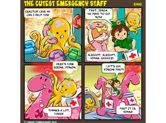The 90th interactive comic strip for my "Soul Snacks by Didgit" have been uploaded to my Facebook and Twitter/ Twitpic's accounts on Wednesday, October 8, 2014. Vimna and Jinga are pretending to be emergency nurses. Look who are helping them out! We want to give appreciation to all the dedications and assistance that they give us. If you have cool stories like this one, please share them with me on my Facebook account (Go to my web: www.didgitcobbleheart.com and click the Facebook's icon on the lower right hand side) or my Twitter/ Twitpic's account @cobbleheart. I can make them into cool comic formats like this one. "Soul Snacks by Didgit" is a weekly interactive comic strip that will be available on my Facebook and Twitter/ Twitpic's accounts every Wednesday! Stay tune for the next edition, or better, send me your ideas so you can show your friends your own comic strip! Truly Yours, Didgit |