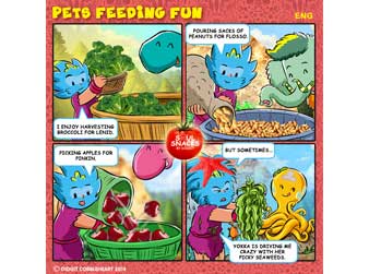 Fuzzy loves his pets so much, and one of his favorite routine is feeding them their favorite vegatables and fruits himself. Each of them has his or her own picky likings, but Yokka is the worst amongst them. She likes different kinds of seaweeds every day, and Fuzzy has to swim the ocean finding the ones she wants. If you have cool stories about your pets and their favorite food, please share them with me on my Facebook account (Go to my web: www.didgitcobbleheart.com and click the Facebook's icon on the lower right hand side) or my Twitter/ Twitpic's account @cobbleheart. I can make them into cool comic formats like this one. "Soul Snacks by Didgit" is a weekly interactive comic strip that will be available on my Facebook and Twitter/ Twitpic's accounts every Wednesday! Stay tune for the next edition, or better, send me your ideas so you can show your friends your own comic strip! Truly Yours, Didgit |