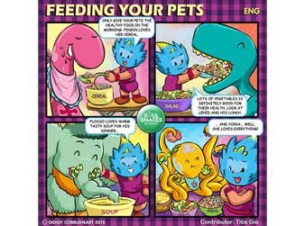 The 119th interactive comic strip for my Soul Snacks by Didgit have been uploaded to my Facebook and Twitter/ Twitpics accounts on Wednesday, May 6, 2015. This time, a friend of mine from Yogyakarta, Titis Gie, sent me the story idea. She loves Fuzzys pets so much that she has a complete idea on what to feed them every day, from breakfast to dinner! Isnt that way cool?! So, if you have cool story ideas like this one, please share them on my Facebook account (Go to my web: www.didgitcobbleheart.com and click the Facebooks icon on the lower right hand side) or my Twitter/ Twitpics account @cobbleheart. I can make them into cool comic formats like this one. Soul Snacks by Didgit is a weekly interactive comic strip that will be available on my Facebook and Twitter/ Twitpics accounts every Wednesday! Stay tune for the next edition, or better, send me your ideas so you can show your friends your own comic strip! Truly Yours, Didgit |