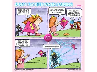 The 151st interactive comic strip for my Soul Snacks by Didgit have been uploaded to my Facebook and Twitter/ Twitpics accounts on Wednesday, January 13, 2016. My dear supporter, Aunty Titis Gie, has sent me another of her story idea! Wow! She has plenty! Thank you so much for giving me cool story ideas, Aunty Titis! Really appreciate it. Indonesia is in the rainy season this time of the year, and she knows that a lot of children love to fly kites. So she wants me to help inform children to be extra careful and mindful to fly kites when its about to rain. Lightning is dangerous, and can struck you when you fly kites. Keep that in mind. Have fun with your kites, but be safe as well. If you have your unique story like this or other interesting stories, please share them on my Facebook account (Go to my web: www.didgitcobbleheart.com and click the Facebooks icon on the lower right hand side) or my Twitter/ Twitpics account @cobbleheart. I can make them into cool comic formats like this one. Soul Snacks by Didgit is a weekly interactive comic strip that will be available on my Facebook and Twitter/ Twitpics accounts every Wednesday! Stay tune for the next edition, or better, send me your ideas so you can show your friends your own comic strip! Truly Yours, Didgit |