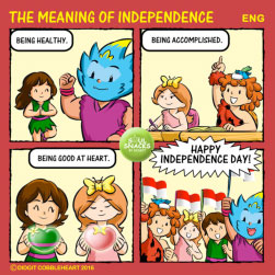 The 181st interactive comic strip for my "Soul Snacks by Didgit" have been uploaded to my Facebook and Twitter/ Twitpic's accounts on Wednesday, August 17, 2016. Today is Indonesia's independence day! We like to shout "merdeka" or "independent" on this day. But, what independence really mean to kids like us? I share some of our interpretation of independence with you. If you have your unique thought about independence story like this or other interesting stories, please share them on my Facebook account (Go to my web: www.didgitcobbleheart.com and click the Facebook's icon on the lower right hand side) or my Twitter/ Twitpic's account @cobbleheart. I can make them into cool comic formats like this one. "Soul Snacks by Didgit" is a weekly interactive comic strip that will be available on my Facebook and Twitter/ Twitpic's accounts every Wednesday! Stay tune for the next edition, or better, send me your ideas so you can show your friends your own comic strip! Truly Yours, Didgit |